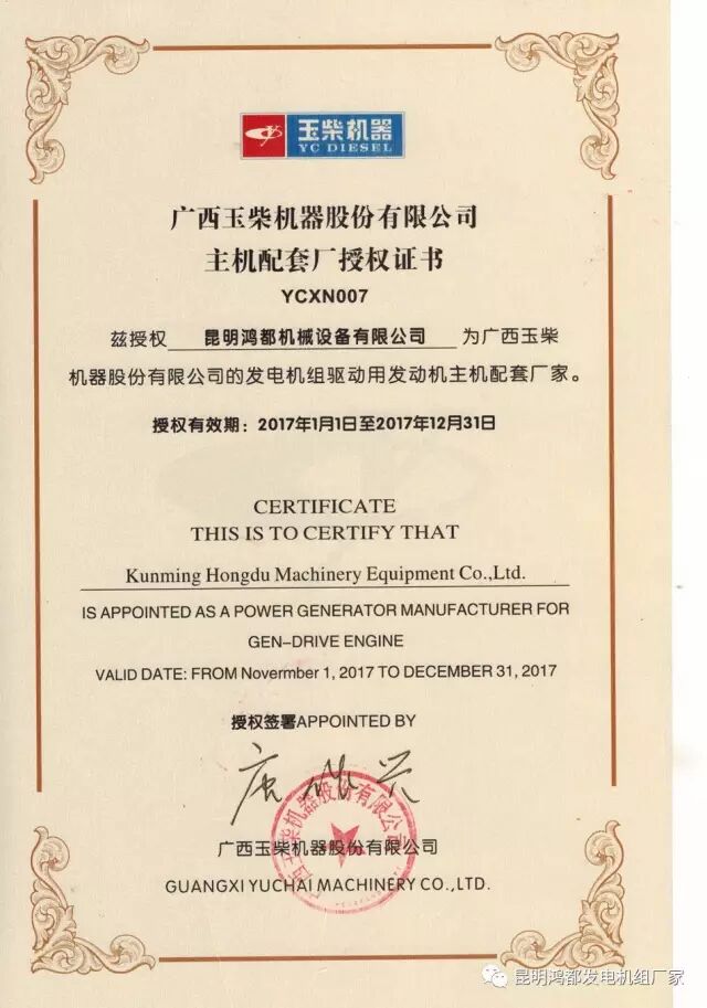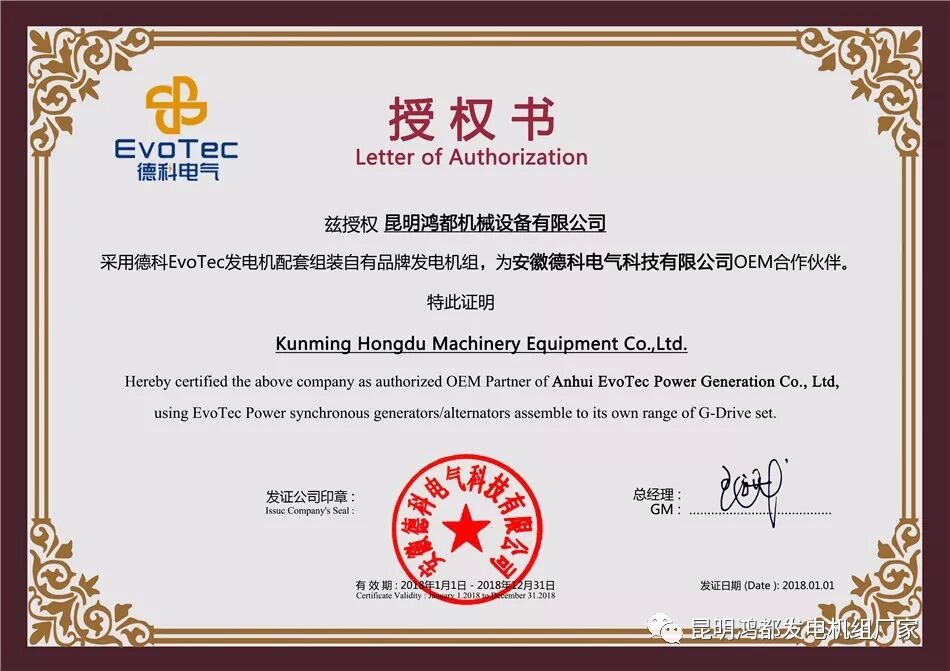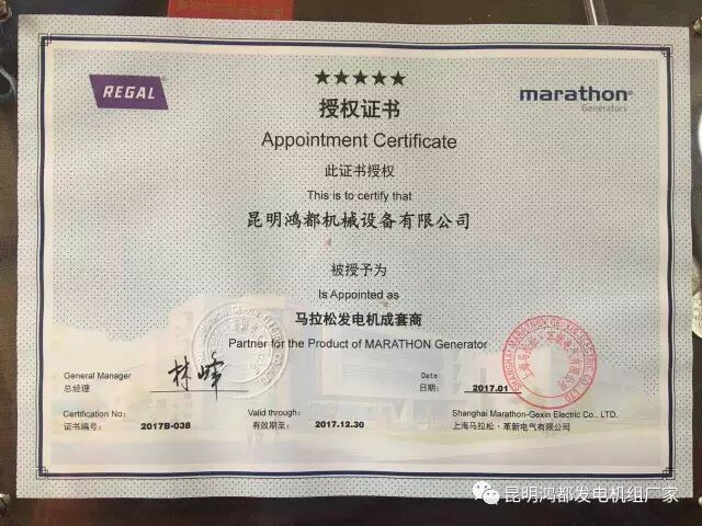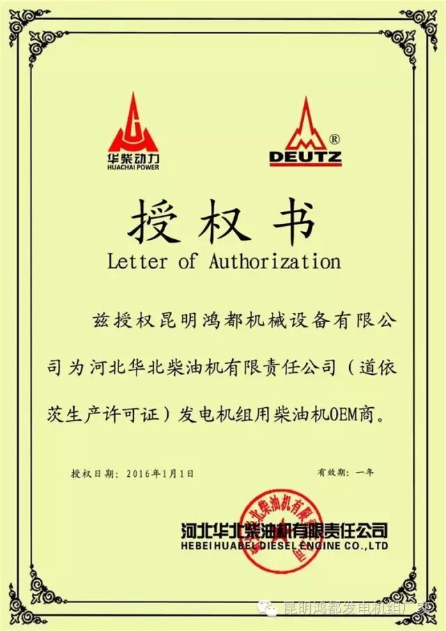 鴻都公司最新榮譽(yù)資質(zhì)等您來(lái)檢閱-OEM供應(yīng)商廠家授權(quán)以下是各柴油機(jī)廠家,電機(jī)OEM廠家等供應(yīng)商授權(quán)資質(zhì)證書(shū),有授權(quán),有保障! 公司自成立以來(lái),不斷謀求新的發(fā)展,注重技術(shù)的改進(jìn)和設(shè)備的更新?lián)Q代,引進(jìn)先進(jìn)的生產(chǎn)設(shè)備。讓客戶(hù)放心用電是公司的發(fā)展目標(biāo),不驕不躁、嚴(yán)謹(jǐn)踏實(shí)是公司的一貫工作作風(fēng),幾年來(lái),公司在已有成績(jī)的基礎(chǔ)上,不懈努力、開(kāi)拓進(jìn)取以最好的產(chǎn)品、最好的服務(wù)、最好的信譽(yù)為宗旨服務(wù)廣大客戶(hù)。 我們的理念為:“誠(chéng)信為本、實(shí)力為先,全心全意為客戶(hù)”,我們公司秉承客戶(hù)至上、服務(wù)至上的經(jīng)營(yíng)理念,以卓越的技術(shù)服務(wù)品質(zhì)、專(zhuān)業(yè)的技術(shù)服務(wù)實(shí)力、技術(shù)精湛的客戶(hù)服務(wù)團(tuán)隊(duì),保障客戶(hù)在用電需求的高速路上馳騁,又以穩(wěn)固、發(fā)展、忠誠(chéng)、高效、團(tuán)結(jié)與創(chuàng)新的精神,尊重人才注重技術(shù),使每位客戶(hù)在享受用電需求和最新產(chǎn)品的同時(shí)不斷獲得最大的收益。 發(fā)電機(jī)組專(zhuān)業(yè)廠家,專(zhuān)業(yè)行業(yè)管理經(jīng)驗(yàn),專(zhuān)業(yè)檢測(cè)中心,專(zhuān)業(yè)技術(shù)人員,專(zhuān)業(yè)設(shè)備,專(zhuān)業(yè)制造,專(zhuān)業(yè)服務(wù),專(zhuān)業(yè)售后,專(zhuān)業(yè)團(tuán)隊(duì),為您護(hù)航。 馬拉松/德科/互泰電機(jī)/WATTEK等電機(jī)廠家授權(quán)書(shū) 鴻都在昆明設(shè)有工廠,海量的機(jī)組和零配件庫(kù)存隨時(shí)滿(mǎn)足不同客戶(hù)不同需求,工廠倉(cāng)庫(kù)現(xiàn)貨充足,品種齊全,來(lái)鴻都可滿(mǎn)足你的一切用電需求。 鴻都作為生產(chǎn)廠家,采用品牌直銷(xiāo)模式,省去中間商費(fèi)用,讓產(chǎn)品從流水線(xiàn)直接到達(dá)您的手中,讓您以最優(yōu)惠的價(jià)格獲得高品質(zhì)的發(fā)電機(jī)組,享受實(shí)實(shí)在在的優(yōu)惠。 24小時(shí)電話(huà)開(kāi)通,隨時(shí)接聽(tīng)客戶(hù)來(lái)電處理遇到的問(wèn)題,并提供專(zhuān)業(yè)系統(tǒng)化的解決方案免除您的后顧之憂(yōu),并根據(jù)實(shí)際情況指派專(zhuān)業(yè)技術(shù)人員上門(mén)服務(wù);昆明市區(qū)售后服務(wù)響應(yīng)時(shí)間為1小時(shí),地州售后服務(wù)響應(yīng)時(shí)間為5小時(shí)!省外24 小時(shí)之內(nèi)。 昆明發(fā)電機(jī),昆明發(fā)電機(jī)組,昆明柴油發(fā)電機(jī),昆明柴油發(fā)電機(jī)組,昆明發(fā)電機(jī)價(jià)格,昆明靜音發(fā)電機(jī),昆明發(fā)電機(jī)廠家,昆明發(fā)電機(jī)型號(hào),昆明玉柴發(fā)電機(jī)組,昆明康明斯發(fā)電機(jī)組,昆明道依茨發(fā)電機(jī)組,昆明濰柴發(fā)電機(jī)組,昆明沃爾沃發(fā)電機(jī)組,昆明上柴電機(jī)組,昆明發(fā)電機(jī)組價(jià)格